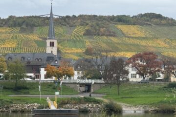 23-10-25 Donderdag. Vertrek uit Zeltingen waar we drie nachten zijn geweest, en mooie fietstochten gemaakt hebben en ook nog een keer lekker gegeten hebben. En dan gaan we op weg de hele moezel af tot aan Koblenz en dan verder richting Andernach en komen we aan bij de Rijn en Andernach bij de camperplaats, waar wij ook nog een mooi plekje voor de camper krijgen, maar het weer ziet er hier anders uit regen en zeer harde wind